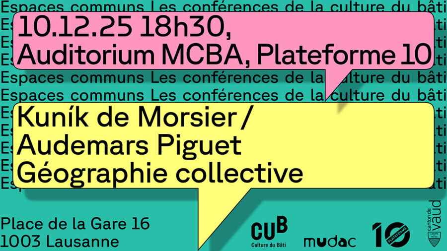 À travers quatre conférences annuelles, la Direction générale des immeubles et du patrimoine de l’Etat de Vaud, le mudac et la Fondation Culture du Bâti – CUB donnent la parole à celles et ceux qui conçoivent et fabriquent la ville par l’architecture, le paysage, les infrastructures ou encore les arts plastiques. Pour clore l’année, les architectes Kuník de Morsier et les horlogers Audemars Piguet discutent de géographie collective..